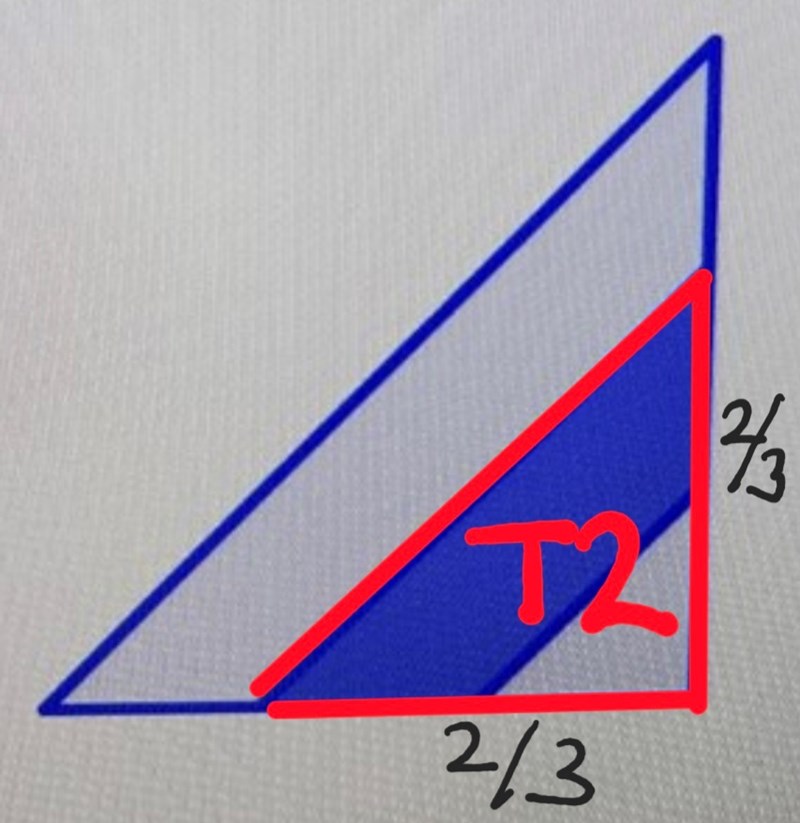 - T2 har basen 2/3, höjden 2/3 och alltså arean A2 =(2/3)*(2/3)/2 = (4/9)/2 = 2/9 a.e.