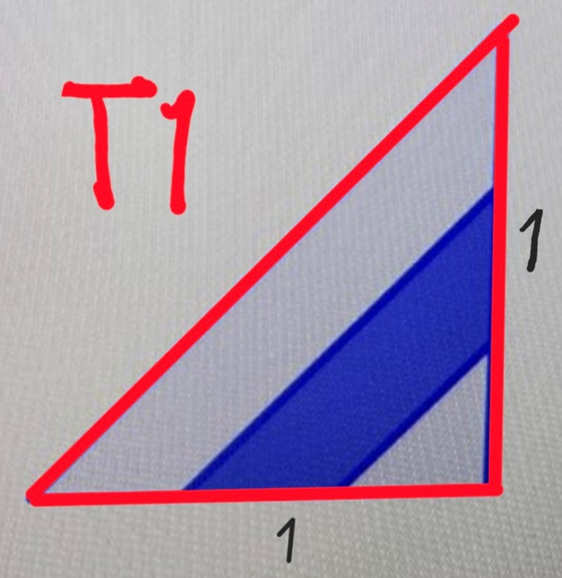 - T1 har basen 1, höjden 1 och alltså arean A1 = b*h/2 = 1*1/2 = 1/2 a.e.