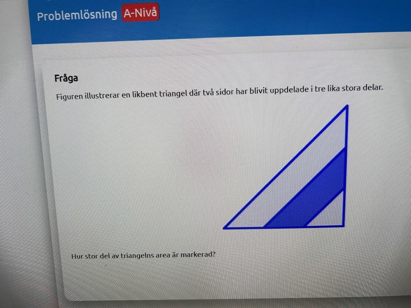 Kan du nu ta fram ett uttryck för hur stor andel av den stora trianelns area som det blåa fältet utgör?