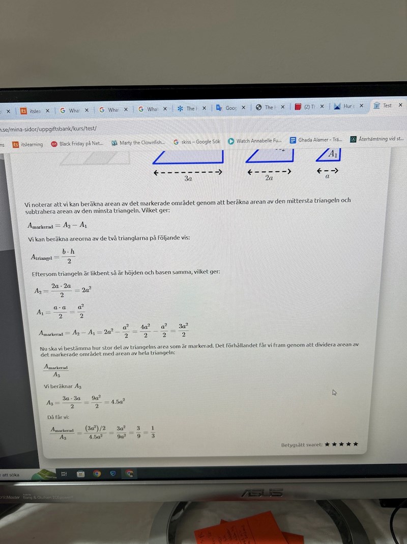 Och de frågar efter hur stor del av den stora triangeln (area 1/2) som är blåmarkerad (area 1/6).