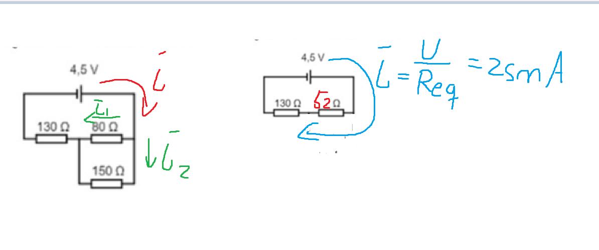 Precis, så det man då kan göra är att ta reda på den totala spänningen över 52 ohms resistorn. Detta ger oss skillnaden i potentialen mellan båda ursprungliga resistorerna. Eftersom dessa två ligger i parallel, så har de samma spänningen över sig.