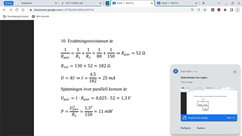 När du slår ihop de två resistorerna som är parallella så ligger den nya resistorn (52 ohms resistorn) och 130 ohms resistorn i serie. Vad kan vi säga om strömmen genom alla komponenter som ligger i serie?