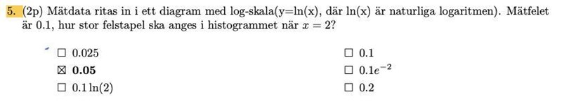 Mätdata ritas in i ett diagram med log-skala (y=ln(x)). Mätfelet är 0.1, hur stor felstapel ska anges i histogrammet när x=2?