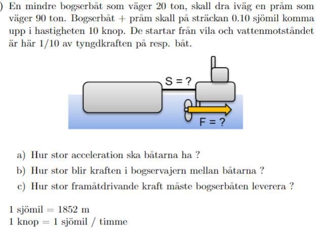 I b-uppgiften efterfrågas en kraft. Med antagandet från a-uppgiften om konstant acceleration - vilken formel förbinder acceleration och kraft? Titta på pråmen t.ex. Vilka krafter verkar på den? De vertikala krafterna tar ut varandra eftersom den inte sjunker eller stiger (och börjar sväva). De horisontella krafterna ska ge pråmen en acceleration (den som du beräknade i a).