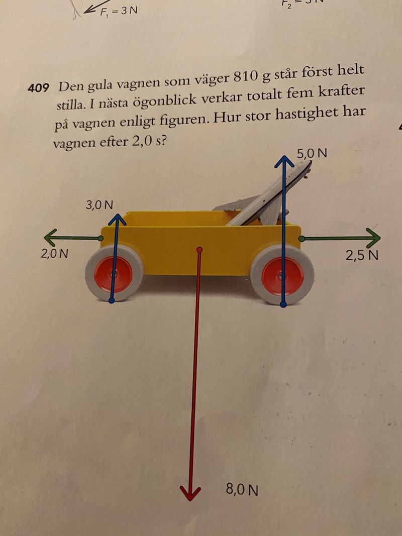 Efter att man har summan av krafterna i X-led kan man lösa ut den resulterande accelerationen i X-led. Om man accelererar i 2 sekunder, vilken hastighet får man då?