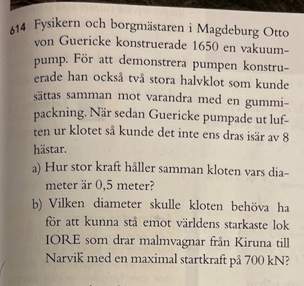 Halvkloten hålls på plats av lufttrycket. Beräkna hur stor kraft som lufttrycket utövar på klotet.