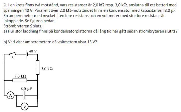 Då spänningen i voltmetern över kondensatorn är 13V måste 13V också gå igenom 2kOhm resistorn då de är parallella.