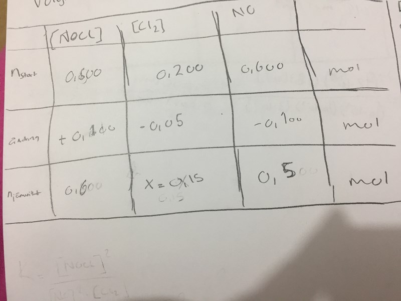 Ett kärl med volymen 50,0 dm3 införs 0,600 mol kvävemonoxid, 0,200 mol klorgas och 0,500 mol nitrosylklorid, NOCl. Jämvikten ställer in sig vid 1100 K.