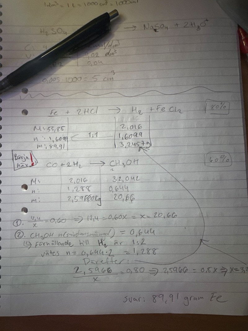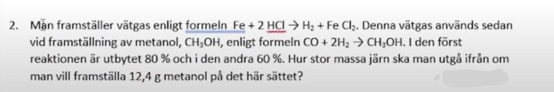 Nu vet jag inte vilken approach du tänkt ta för att lösa uppgiften, men det är irrelevant och behövs inte veta för att lösa den. Vi är bara intresserade av H2. Börja med att ta reda på substansmängden för metanol ifall vi fått 100% utbyte.