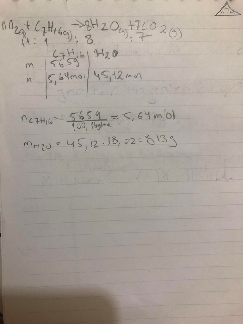 Hur stor massa vatten resp. Koldioxid bildas vid fullständigt förbränning av 565 g heptan, C_7 H_16 ? Börjar med att skriva fullständigt reaktionsformel.