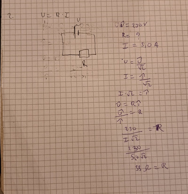 Toppvärdet är väl 230 V för U samt 5.0 A för I? Då får man ut strömmen enligt ohms lag dvs u_hatt=i_hatt*R?