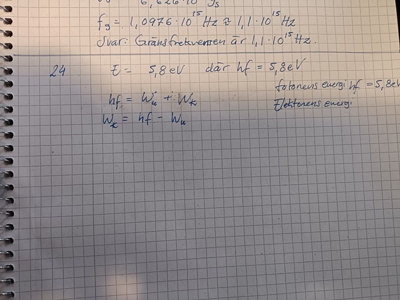 Jag vet att jag ska använda mig av Wk= hf-Wu , då jag ska räkna ut rörelseenergin elektronen, och att hf= 5,8eV, men jag vet inte hur jag ska få fram Wu, det jag antar är elektronens energi?Tacksam för svar :)