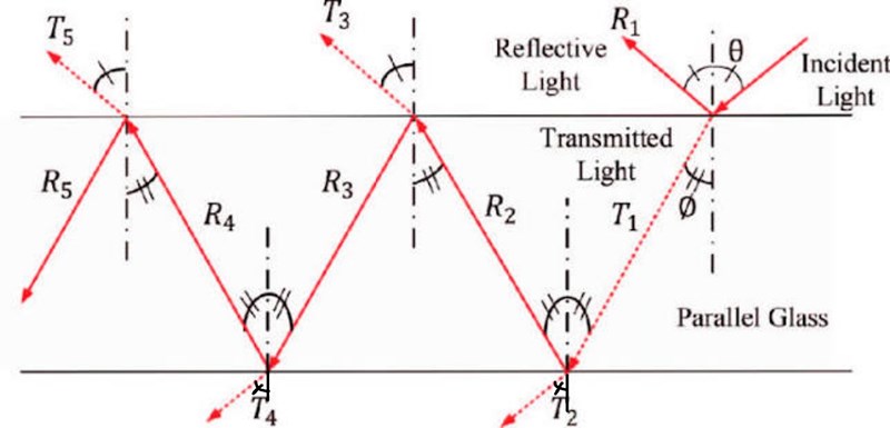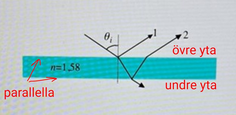 Om plattans ytor är parallella så kommer stråle 2 lämna ytan med brytningsvinkel θi. Den brutna vinkeln i glaset kan inte vara större än arcsin(1/1.58), eftersom strålen kommer från luften med θi < 90°. (Det kan bli totalreflexion om ytorna inte är parallella, för då blir infallsvinklarna olika efter varje reflexion i glaset.)