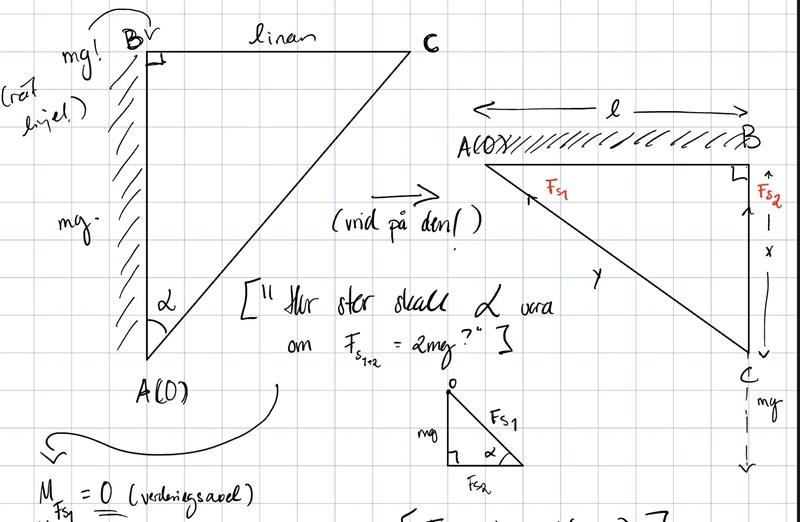Om jag gjort rätt eller inte hittills vet jag ej… men hur ska jag tolka l (vägen till 0)? jag tror att mg går längs B till A och att Fs, den kraft som är en del av ett moment, går längs C till A.