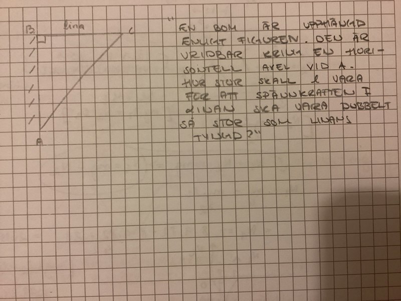 "Hur stor ska vara för att spännkraften i linan ska vara två gånger bommens tyngd."