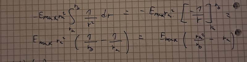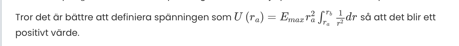 Ok så vi söker ett värde på r_a som maximerar spänningen ? Då behöver man derivera U map på r? U(r)=Emaxr_a^2*(1/rb -1/ra)