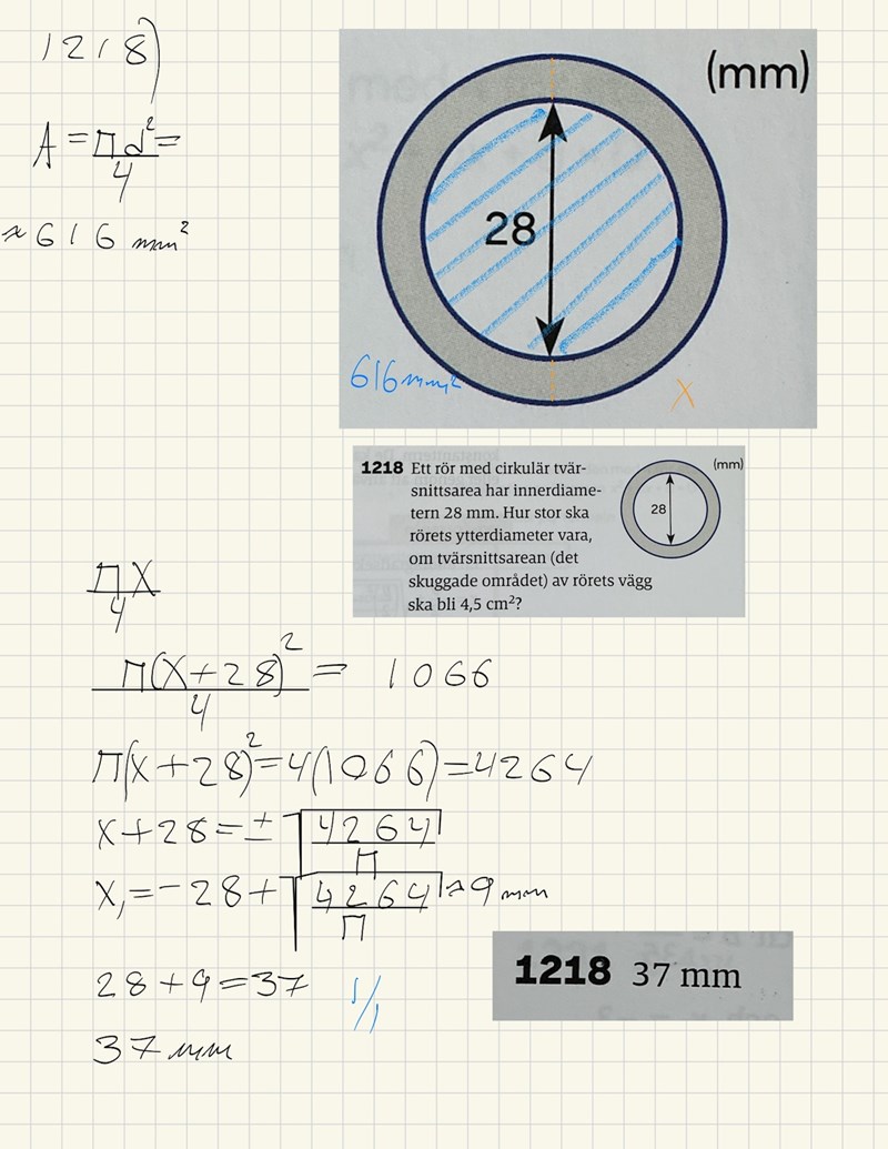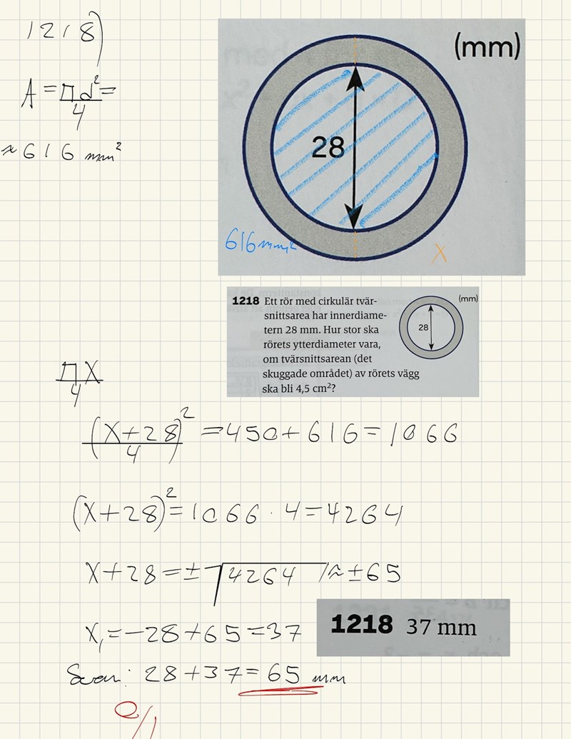 Hur stor ska rörets ytterdiameter vara, om tvärsnittsarean av rörets vägg ska bli 4,5 cm^2?