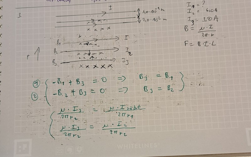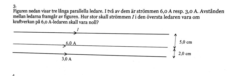 Jag vet mga högerhandsregeln att fältet i 6,0 A och 3,0 A går nedåt. Även den sökta I är fältet nedåt så jag har B1+B2+B3=Btot. Men jag vet ej hur man går vidare sedan!