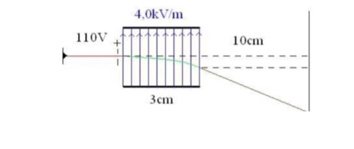 En proton accelereras med spänningen 110 V och passerar därefter genom ett elektriskt fält med fältstyrkan 4,0 kV/m enligt bilden nedan. Fältets längd är 3,0 cm. Bortse från gravitationella krafter i uppgiften. Hur stor sträcka har protonen avlänkats då den lämnar fältet?