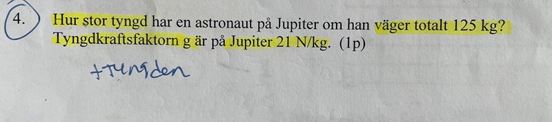Ture skrev:Felikz skrev:Ture skrev:tyngden är 125kg*21N/kg =2625 N, observera enheten!
