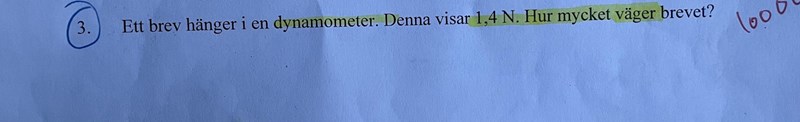 ”upgift 3: ett brev hänger i en Dynamometer. Denna visar 1,4 N. Hur mycket väger brevet?”