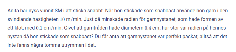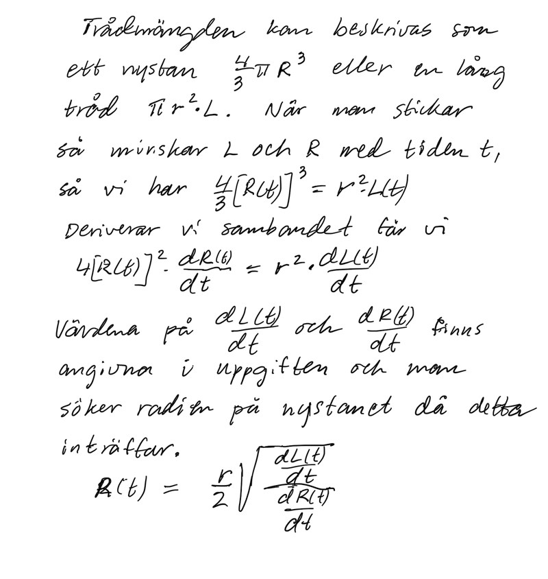 Siffrorna är tagna ur luften av den som skrev uppgiften. Att sticka med en hastighet på 10 m tråd per minut är nog inte möjligt för en människa. Det enda som man har tagit hänsyn till är att dR/dt måste vara mycket mindre än dL/dt. Detta eftersom det försvinner mycket mer materia då klotet minskar i volym jämfört med ett jämntjockt snöre.