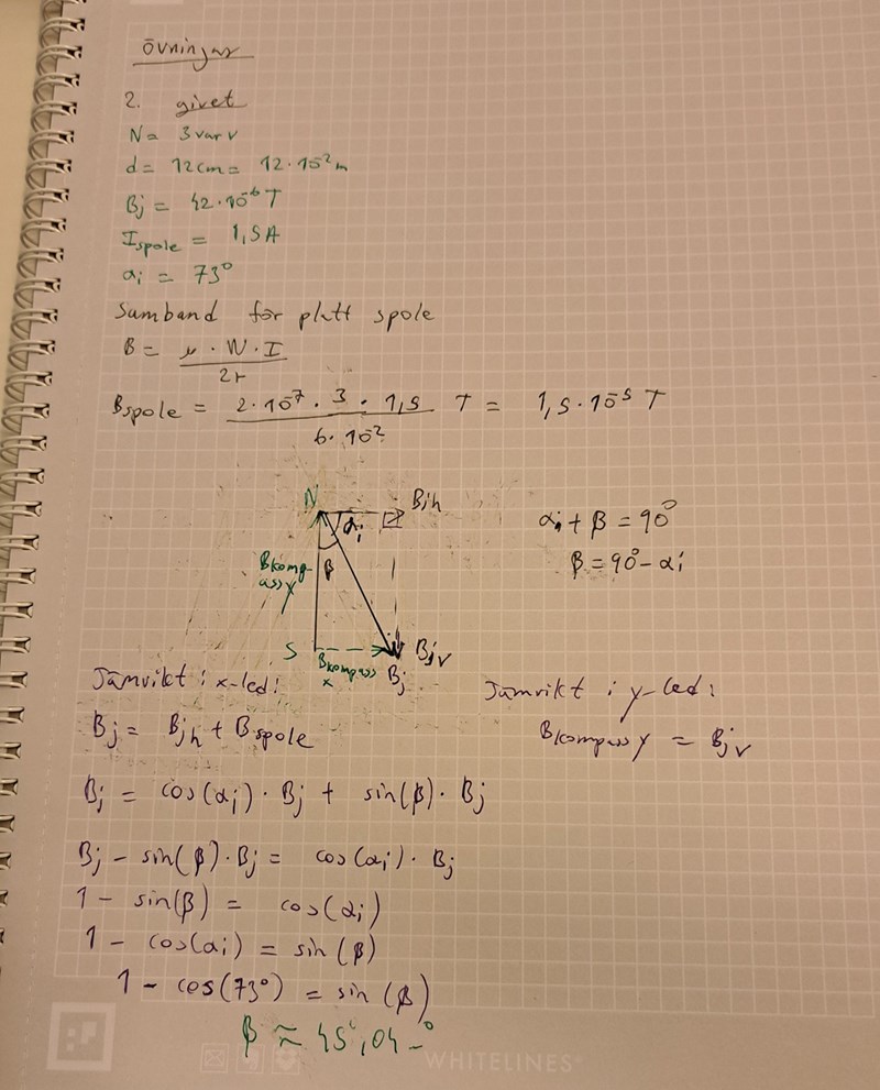 Såhär långt kom jag. Jag misstänker Bkompass i x-led är Bspolen , men sen vet jag ej om jag tänkte rätt här enligt min lösning nedan. Jag fick ut vinkeln nu,doxk vet jag ej om det är rimligt att jag ska dra 90 från 45 grader? Det blir ju bara 45 grader.