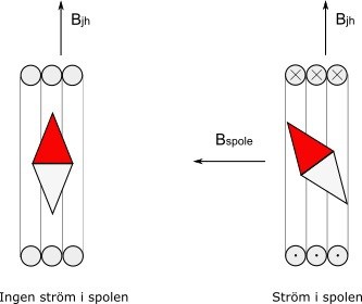 Spole och kompass sett ovanifrån. Spolen i genomskärning.