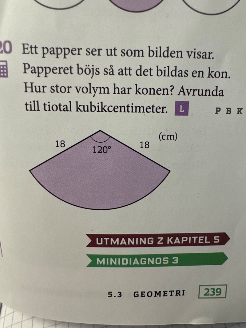 det jag har kunnat konstatera är att det är 1/3 cirkel. Tänkte först räkna ut arean på hela cirkeln med radien o h dividera på 3 men så skulle jag få mantelarean vilket inte är det jag behöver veta. Vet inte vad jag skulle behöva göra härnäst om det jag skrivit är rätt.