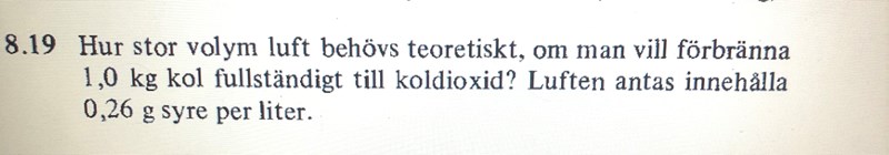 Du vet att det finns 0,26 g syre i 1liter luft. Hur många mol syrgas finns det i 1 liter luft? Hur många mol syrgas behövs det för att reagera med 83,3 mol kol? Hur många liter luft behövs det för att luften skall innehålla så många mol syrgas?