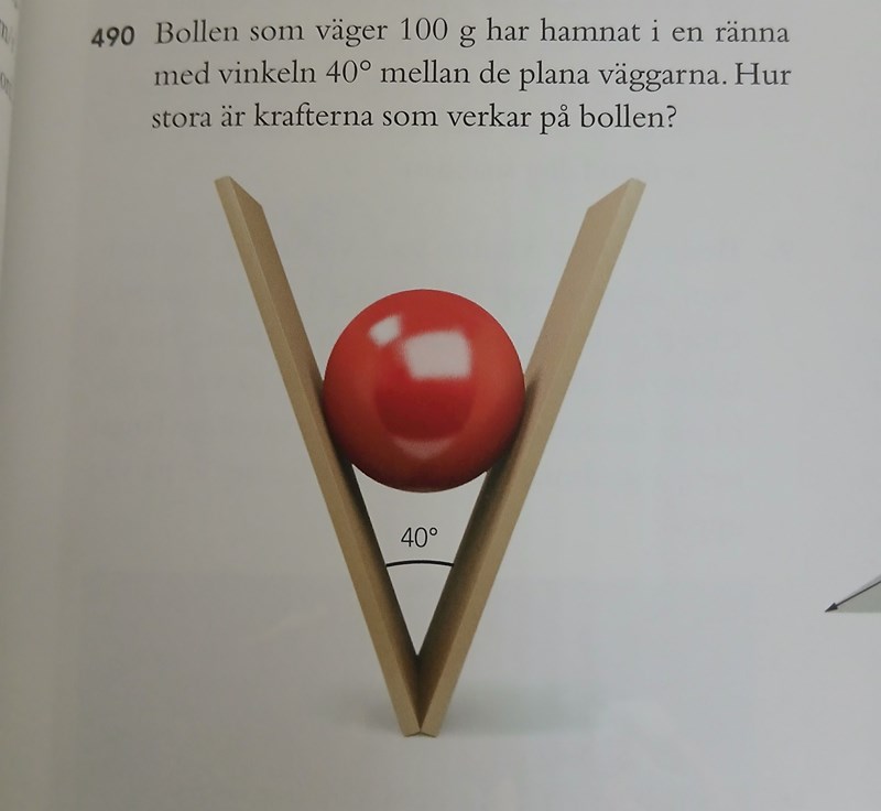 Eftersom bollen ligger stilla så är kraftsummorna lika med 0, både i x- och i y-led.