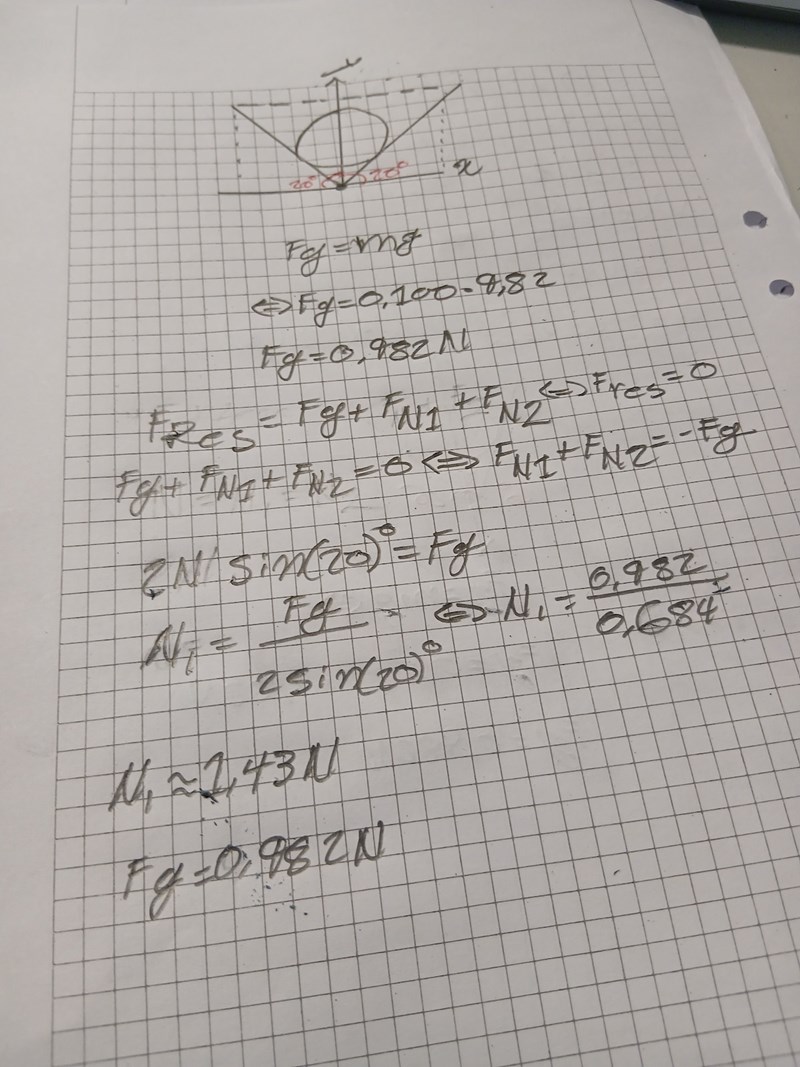 Jag får att storleken på respektive normalkraft är cirka 1,44 N.
