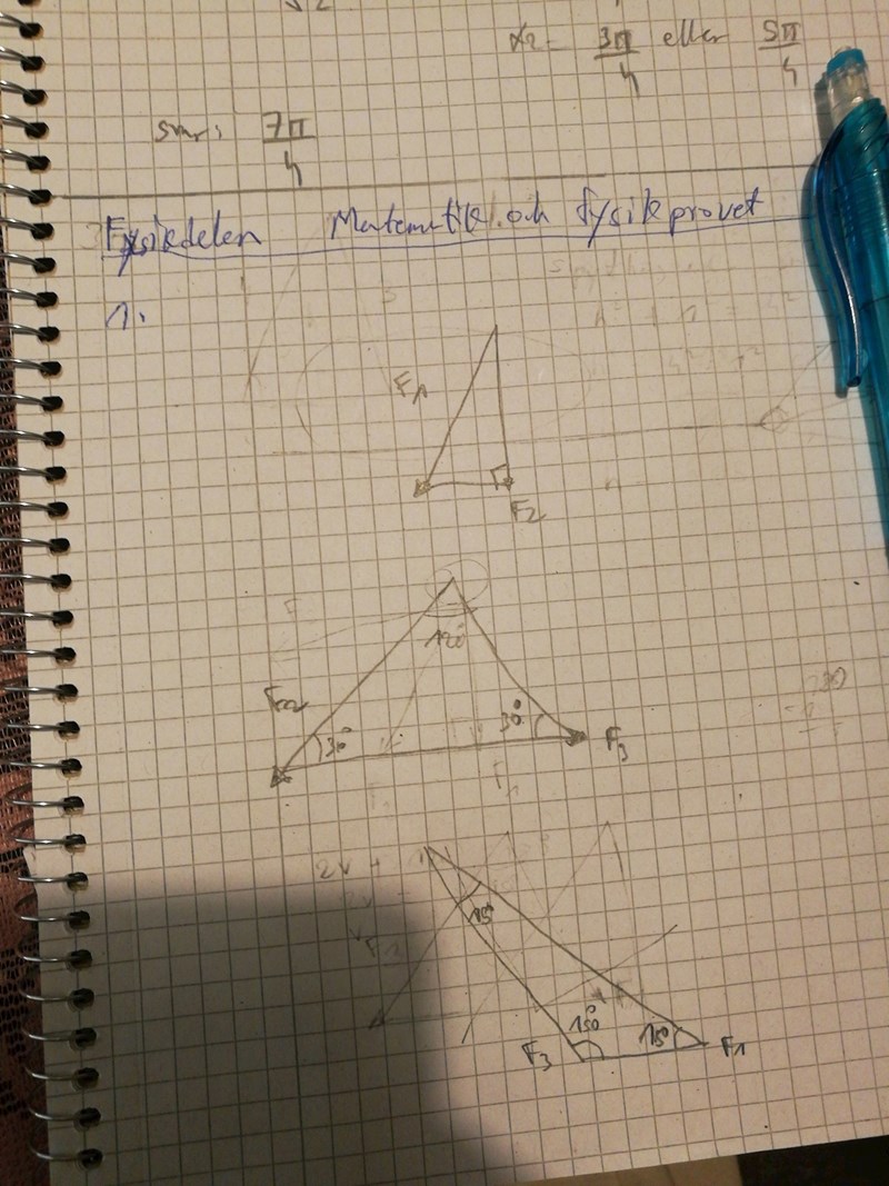 Ebola skrev:Vad har kraften F3 för vinkel mot horisonten? Dess komponent i horisontell led måste vara lika stor som F1, eller hur?