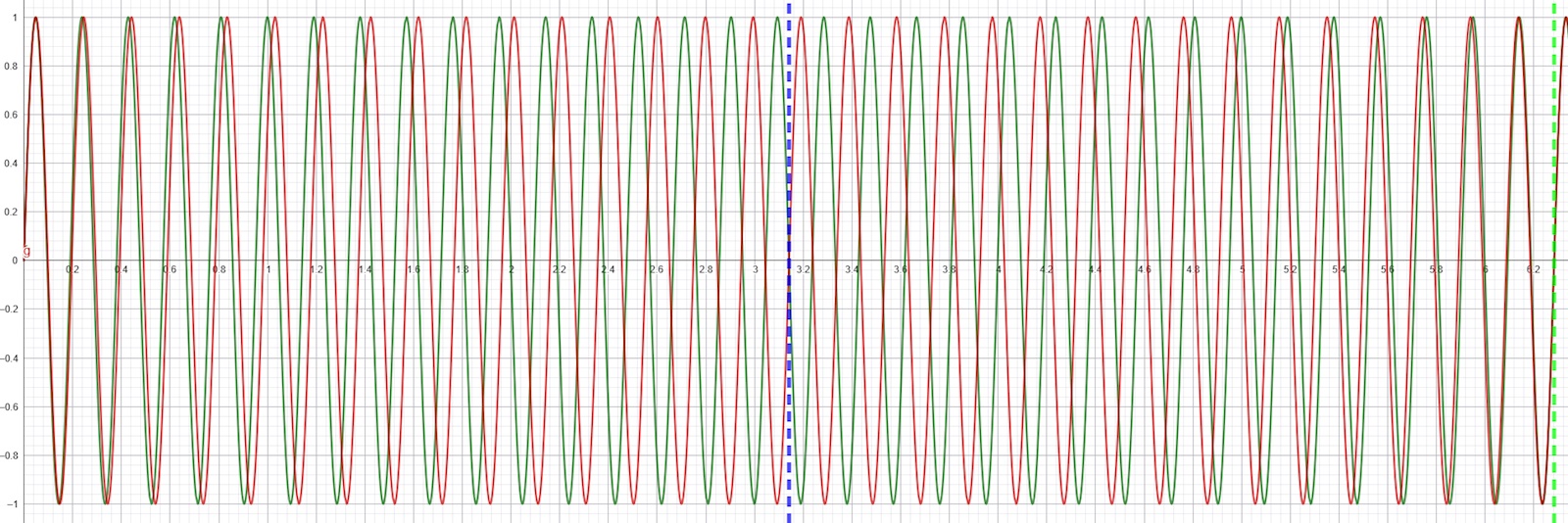 Den ena svänger aningen snabbare än den andra. Vid det blå strecket är de i motfas, där de möts i mitten medan en är på väg upp och den andra på väg ned. Vid det gröna är de åter i fas igen. Då har en fullbordat 33 svängningar och den andra färre.