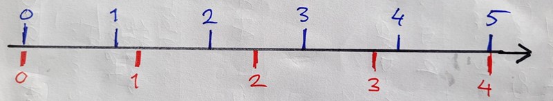 Här är en illustration av ett enklare scenario, där det snabbare förloppet hinner med 5 svängningar på lika lång tid som det långsammare endast hinner med 4 svängningar.