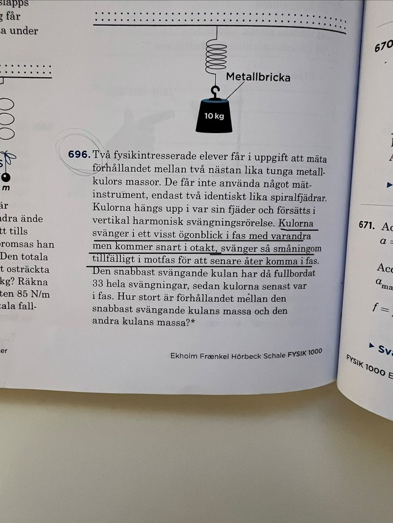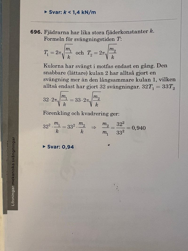 Jag förstår inte vad som menas (se markering). Hur kan detta kopplas till massor? Bör inte den snabba ha hunnit med dubbelt så fler svängningar än den långsamma?