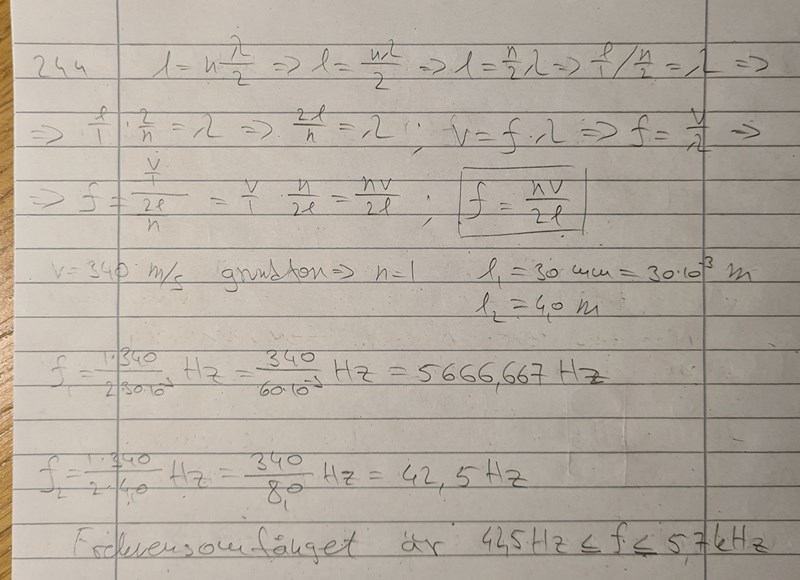 Jag har beräknat båda pipors grundtoner och angett svar, men jag undrar varför man inte kan svara 42,5Hz<_f<_5,7kHz utan måste svara 43Hz<f<5,7kHz ? Frekvensomfånget sträcker sig från 42,5 Hz till 5,7 kHz, så varför kan man inte svara med "större än eller lika med" tecknet för 42,5 Hz respektive "mindre än eller lika med" för 5,7kHz?