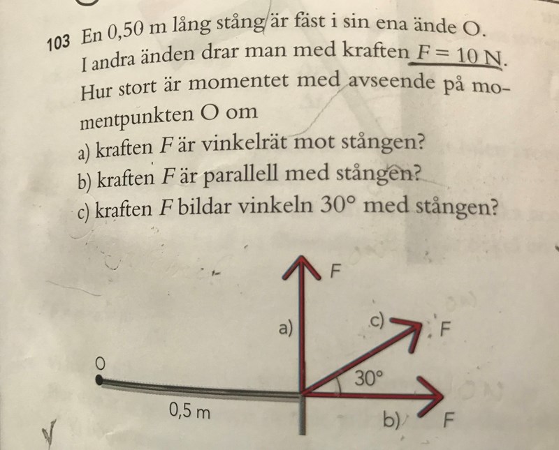 Du kan dela upp kraften i två komposanter, en y-komposant vinkelrät mot stången och en x-komposant parallell med stången. Det gör att du har exakt samma situation som i uppgift a) och uppgift b)