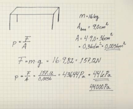De räknar bordets totala massa delat med bordsbenens totala yta. Trycket är lika stort från alla fyra benen.