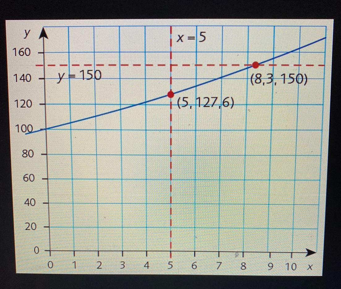 Det framgår inte varför de har ritat streckade linjer vid x = 5 och y = 150. Kanske finns det en fortsättning på uppgiften?