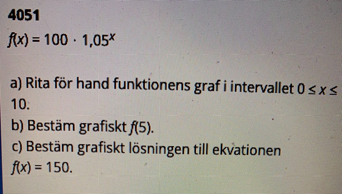 För c-uppgiften: Eftersom grafen du har ritat motsvarar y = f(x) så har ekvationen f(x) = 150 lösningen x-vördet för den punkt på grafen som har y-vördet 150.