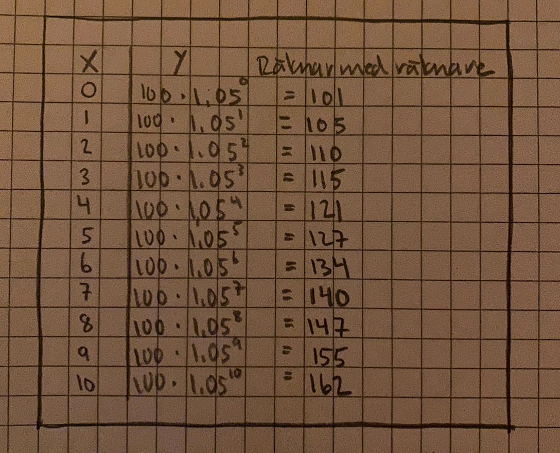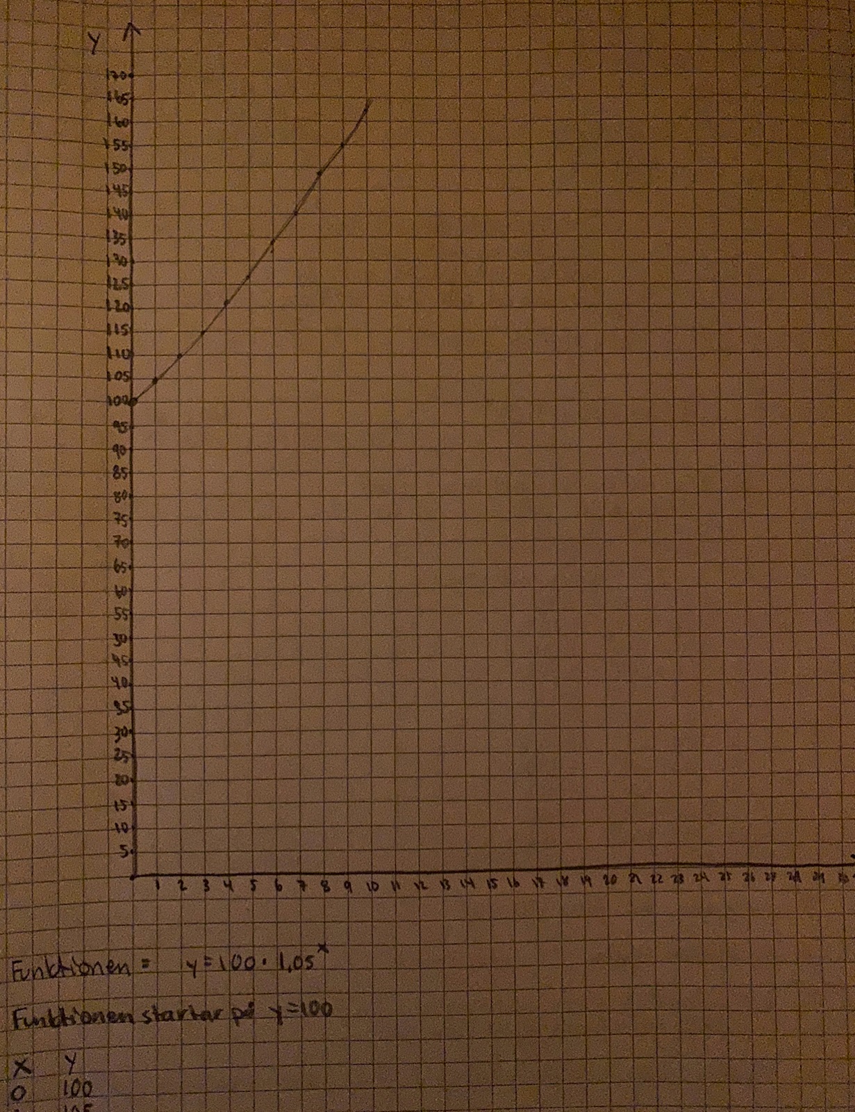 Jag vet att grafens y axel ska starta på 100 så förstår hur den kan se ut. Gjorde denna tabell för att kunna se hur grafen kan se ut. Där x är x axelns värden & y är y axeln, om jag räknar fram de så får jag fram vart jag prickar in liksom grafen.