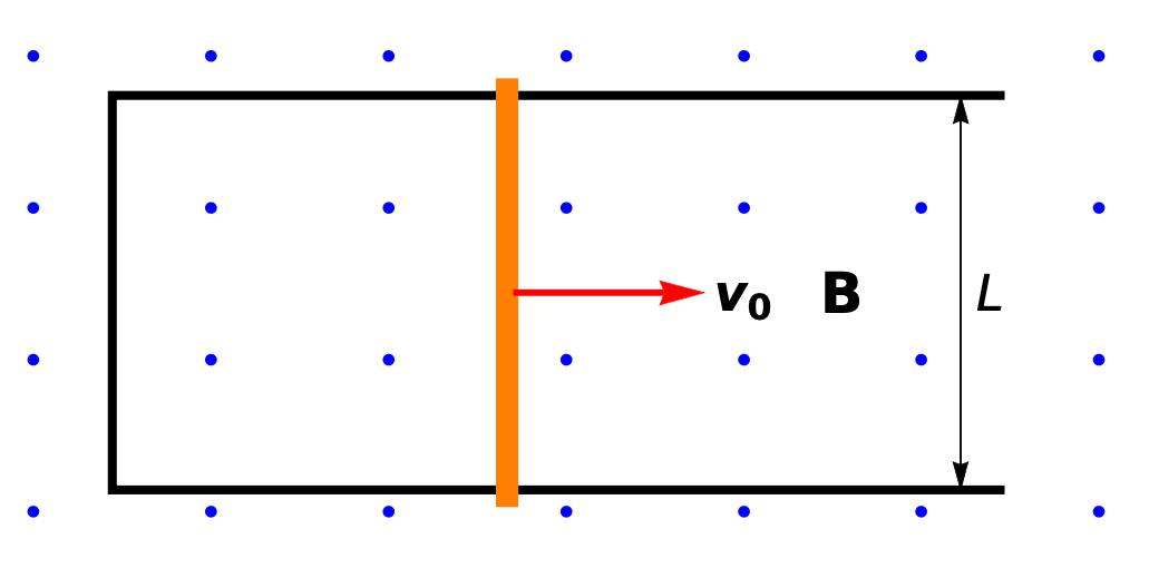 En plan rektangulär slinga (se figur nedan) har en rörlig del som ges en initialhastighet v0 vid tiden t = 0. Slingan befinner sig under hela tiden inom ett konstant magnetfält B riktad ut från pappersplanet och vinkelrät mot slingans plan. Slingan har vidare en bredd L. Den rörliga delen har resistans R och massa m. Försumma resistansen i resten av slingan samt alla icke-magnetiska krafter (friktion, tyngdkraft etc.) på den rörliga delen.