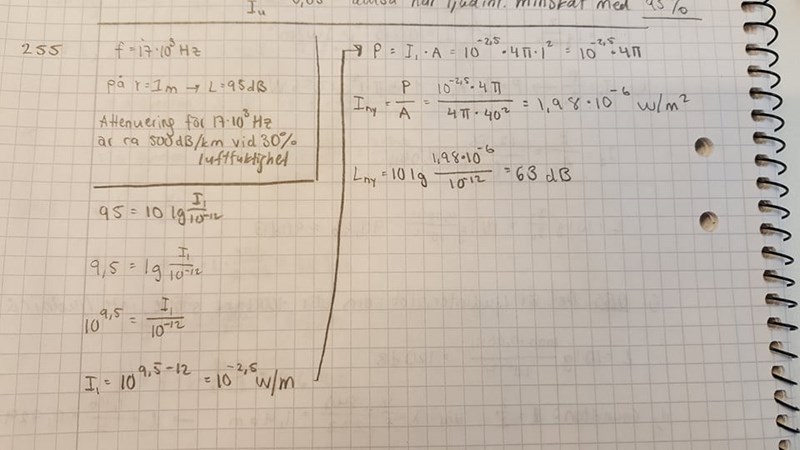 En högtalare sänder ut ett obehagligt pipande ljud med frekvensen 17 kHz. Ljudnivån på 1,0 m avstånd är 95 dB. Attenueringen för 17 kHz ljud i luft är ca 500 dB/km vid 30% luftfuktighet. Hur stor blir ljudnivån 40 m bort?