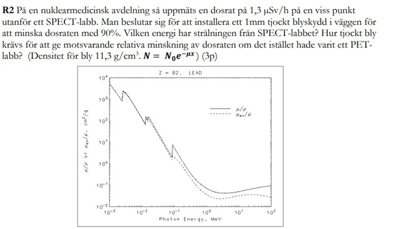 Uppgiften ger information om att 1mm tjockt blyskydd minskar dosraten (som utan något skydd har dosraten 1,3 uSv/h) med 90%. Utifrån detta ska vi kalkylera ut som du frågar μ. Men hur gör jag ens det. Efter att vi har fått ut μ får vi veta vad attinueringskorfficienten är och kan läsa ut energin från diagrammet.