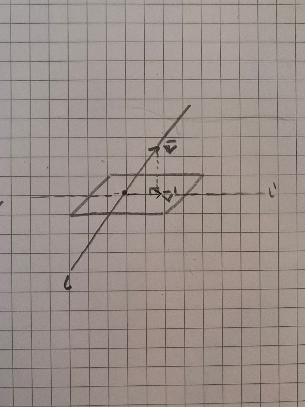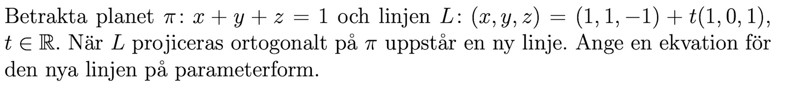 Men lyckas tyvärr inte. Jag tänker problemet på följande vis (se bild nedan): när linjen L (som jag i bilden gett namnet ) projiceras ortogonalt mot planet så uppstår en ny linje (). Jag kan avläsa att linjen har en riktningsrektor (1,0,1) som jag valt att kalla v. Då tänker jag att den ortogonala projektionen v' fås genom att ta (v * e)e. Problemet är att jag inte vet vad vektorn e ska vara här, eftersom jag inte har någon vektor parallell med planet.