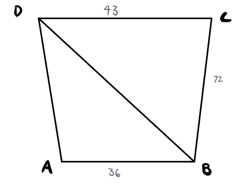 En area har formen av en fyrhörning med hörnen A, B, C och D. Vinkeln ABD är 65°och vinkeln BCD är 80° . Sträckan AB= 36 m , sträckan BC= 72 m och sträckan CD=43 m . Beräkna arean.