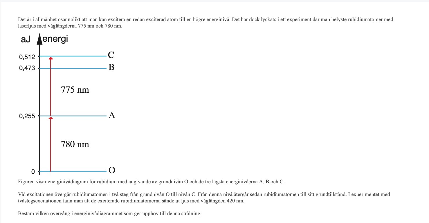 När elektronen befinner sig i C emitterar den en foton med våglängden 420 nm. Denna våglängden motsvarar energin 0,473 aj (med beräkningar). Alltså motsvarar detta att elektronen hoppar från B -> grundtillståndet. Men började elektronen inte i C?