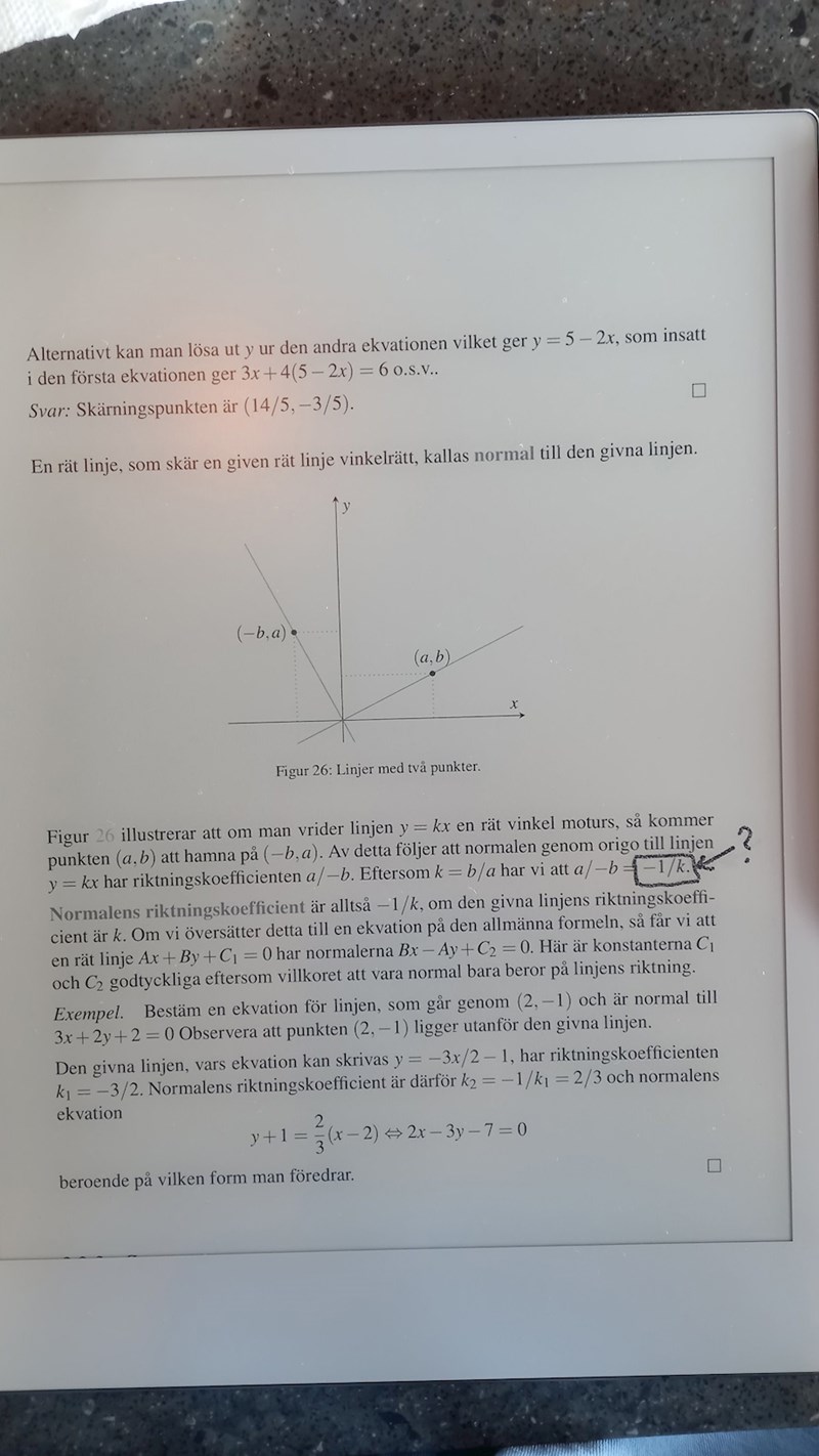 Så om du har tex y=2x så kommer den vinkelräta linjen (normalen) har k-värdet -1/2