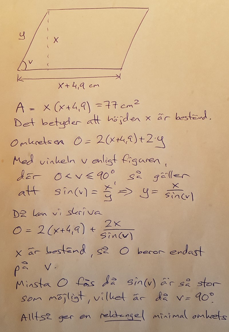 "I en parallellogram är basen 4.9cm längre än höjden. Bestäm den minsta möjliga omkrets parallellogramen [sic!?] kan ha, om dess area är 77cm^2"